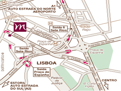 From the A1 motorway (North) and Vasco da Gama Bridge, follow 2a. Circular until you reach the Eixo Norte Sul exit (Sete Rios exit). From the Eixo Norte Sul, take the Sete Rios exit again. From 25 Abril bridge, continue straigt ahead until you reach the Praca de Espanha exit. Just before you reach Praca de Espanha, you will see the sign for the Mercure hotel.